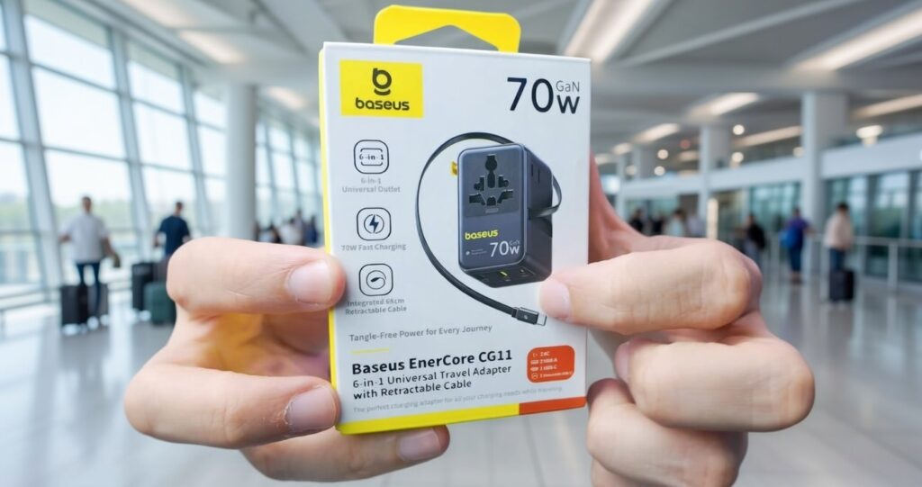 Hoje vou te apresentar uma solução que promete acabar com essa bagunça. Estou falando do Baseus Enercore CG11, um dispositivo que une adaptador universal e carregador de alta potência em um único acessório compacto.